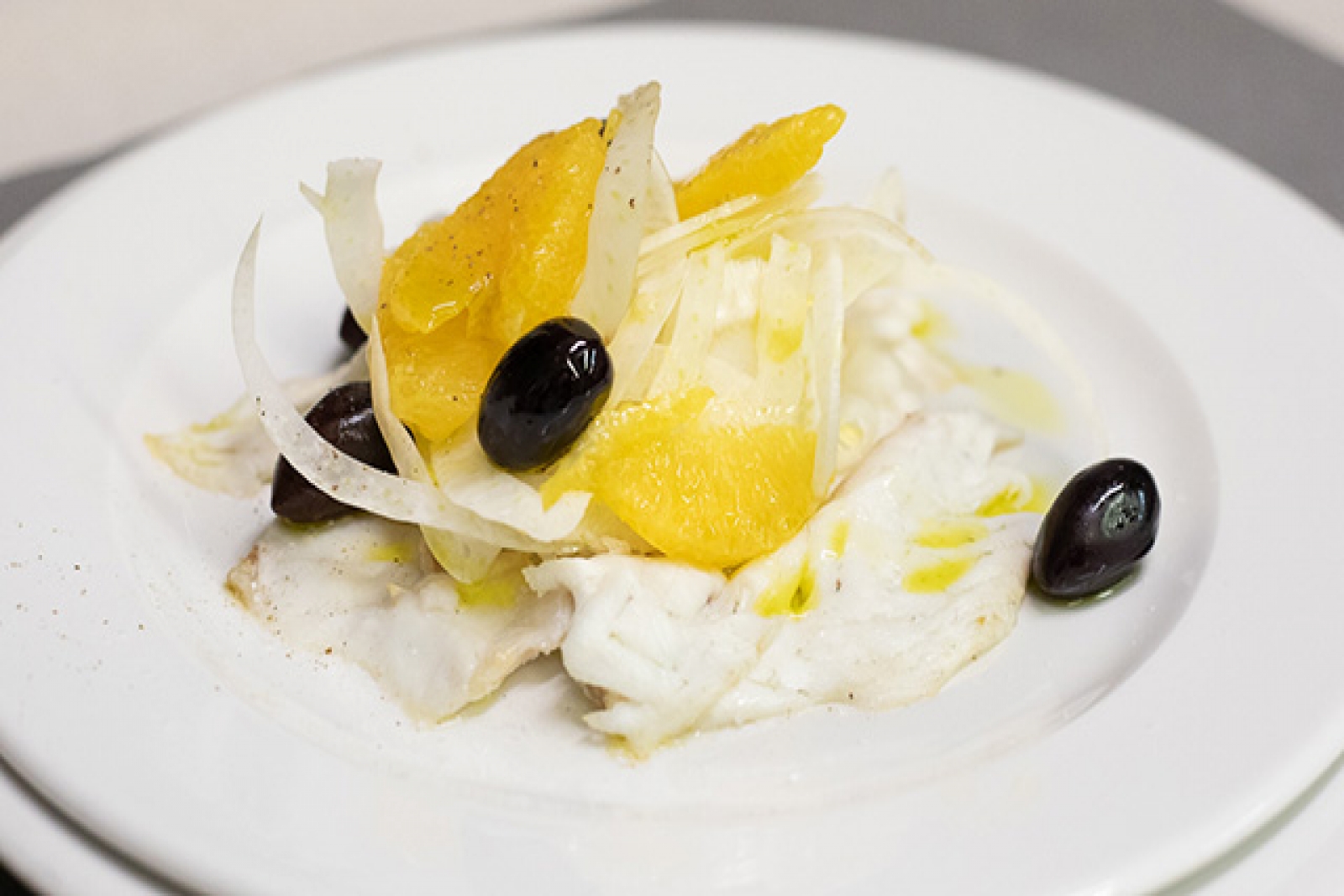 Servito tiepido con isalatina di finocchi, arance e olive nere