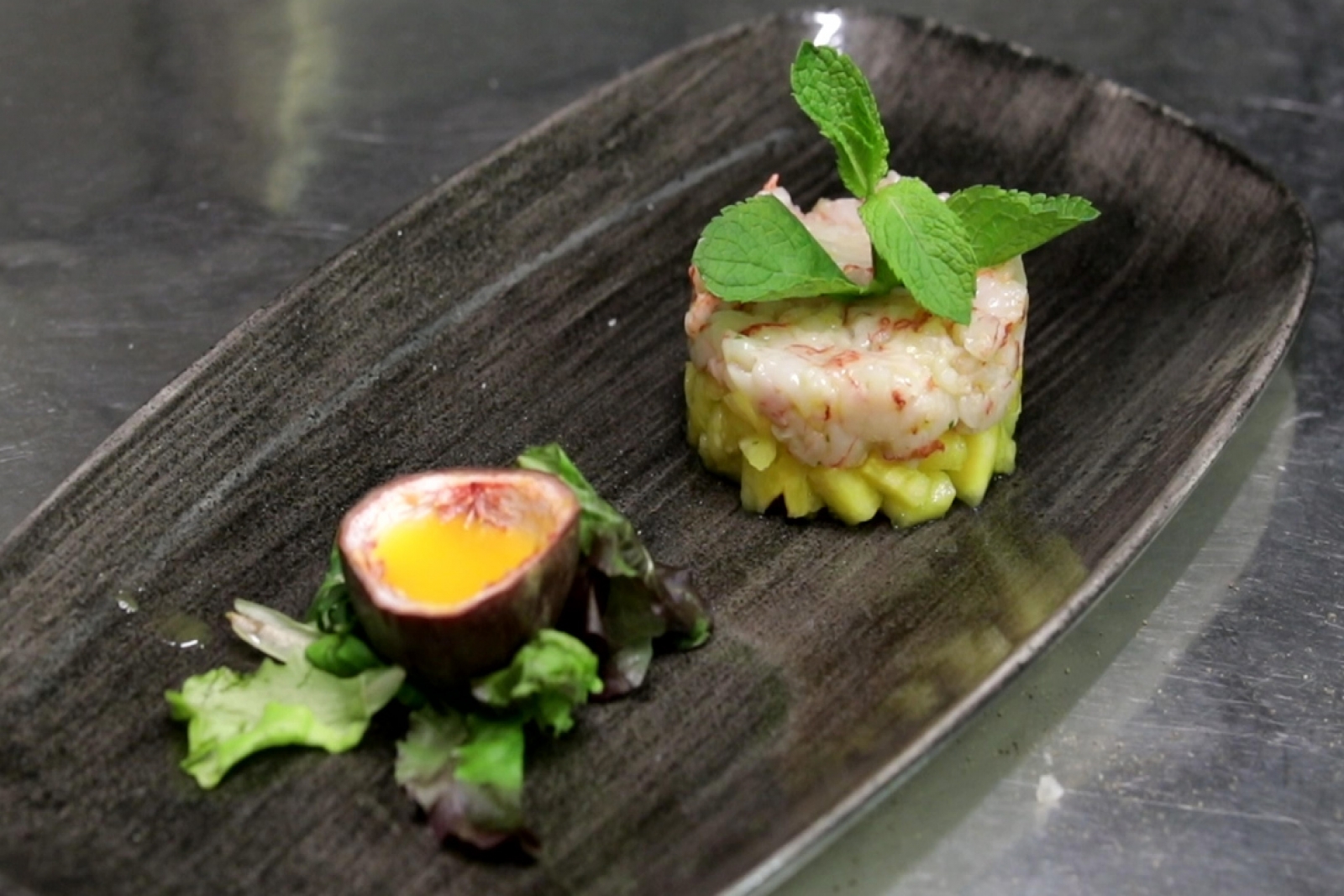 Tartare di gamberi rossi di Sicilia con emulsione al basilico e salsa al frutto della passione.